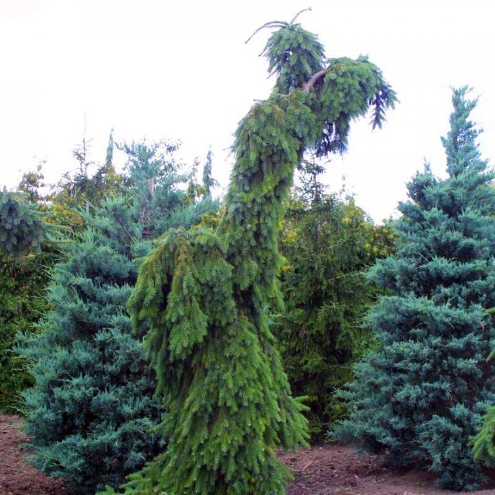 Данный сорт может заинтересовать своей необычной кроной – плакучей. Высота растений – до 20 м, ширина – до 4 м. Хвоя блестящая, тёмно-зелёная и имеет небольшие белые полосочки. Предпочитает солнечные участки.