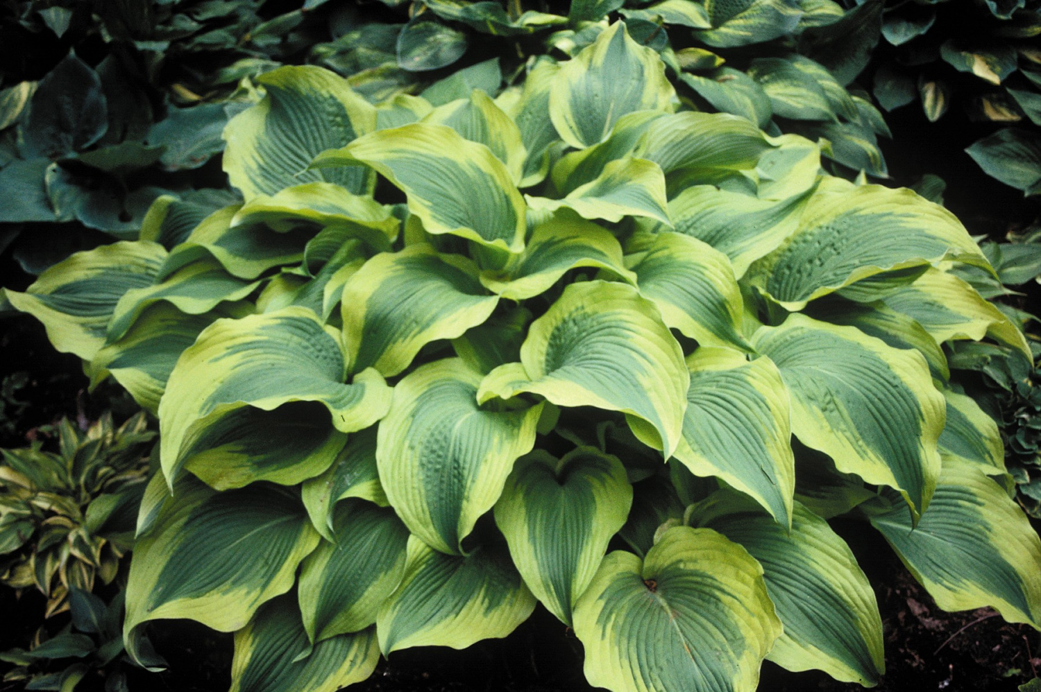 Этот сорт является один из самых распространённых многолетних растений для клумб в тени! Листья имеют необычную окраску – тёмно-зелёные со светлой каймой. Высота растения – до 60 см, ширина – 120-150 см. Цветёт хоста сиреневыми цветками.
