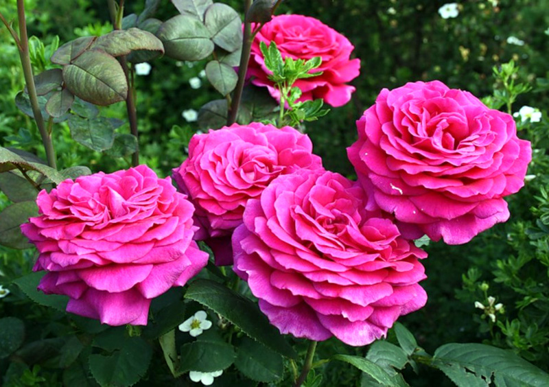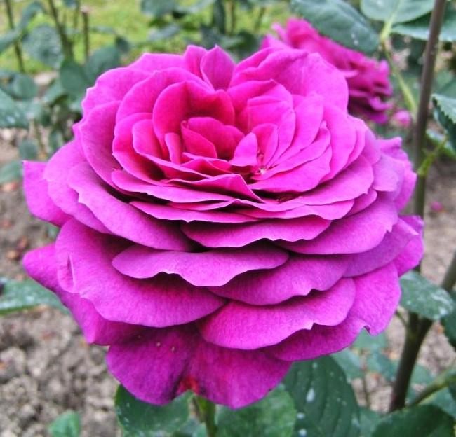 Эта пурпурная роза может стать вашей любимицей на участке! Крупные яркие махровые  цветы (до 12 см) не дают оторвать от себя глаз. Тёмно-зелёная листва кустарника хорошо сочетается с розовыми бутонами. Высота растения – до 175 см, ширина – 100 см. Предпочитает солнечные участки. Ценится за повторное цветение.
