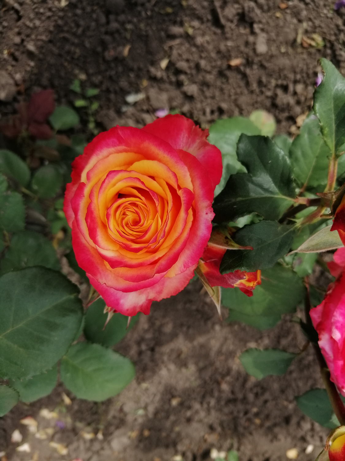 Окрас Силантой – трехслойный, внешние лепестки чередуются от абрикосового к бордовому, внутренние – красновато-оранжевые с бордовыми кончиками, а в самой середине – сочно-персиковые.