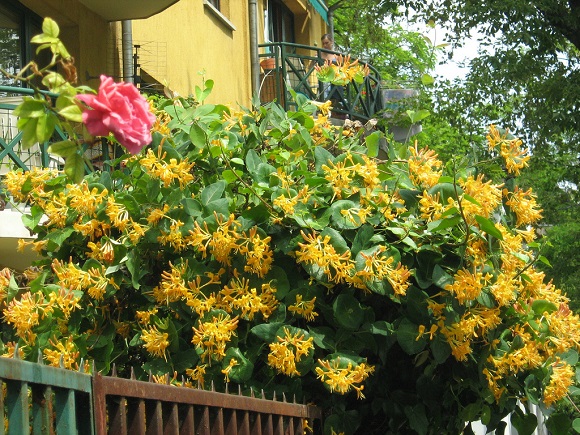 Лиана цветет в течение месяца с конца мая или начала июня. Красные, желтые, розовые или белые цветы наполняют воздух пряным ароматом. К осени вызревают ярко-оранжевые ягоды.