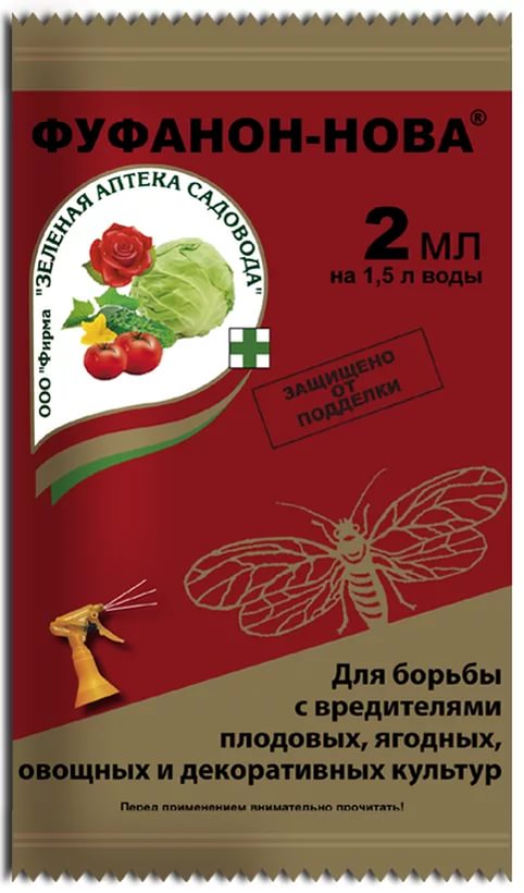 Универсальный эффективный способ борьбы с садовыми вредителями – использование препарата Фуфанон нова. Он уничтожает всех растительноядных паразитов. Важная особенность вещества – быстрое действие, высокая результативность, низкая токсичность, отсутствие специфического запаха.